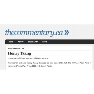 NewsHenry Tsang2023-06-21T13:56:51-07:00 Show All Announcements Events Interviews Guided Tours 2024Henry Tsang2024-07-11T22:01:25-07:00 Guided Tours 2024 White Riot shortlisted for BC Book PrizeHenry Tsang2024-05-06T21:48:24-07:00 White Riot shortlisted for BC Book Prize Engaging Japanese-Canadian HistoryHenry Tsang2024-05-04T13:44:21-07:00 Engaging Japanese-Canadian History Chinatown: Past and FutureHenry Tsang2024-05-04T13:43:50-07:00 Chinatown: Past and Future Reviving RIOT FOOD HEREHenry Tsang2024-05-04T13:48:35-07:00 Reviving RIOT FOOD HERE Race Memory DataHenry Tsang2024-05-06T22:04:20-07:00 Race Memory Data White Riot: A Public Conversation about Powell Street and the Downtown EastsideHenry Tsang2024-05-03T21:58:14-07:00 White Riot: A Public Conversation about Powell Street and the Downtown Eastside Guided Tours 2023Henry Tsang2023-07-09T20:18:56-07:00 Guided Tours 2023 Capilano University TalkHenry Tsang2023-06-21T13:59:34-07:00 Capilano University Talk CTV “The Social” Interview, May 18, 2023Henry Tsang2023-06-21T14:07:57-07:00 CTV “The Social” Interview, May 18, 2023 Toronto Book Launch of White Riot — May 18, 2023Henry Tsang2023-06-20T10:02:33-07:00 Toronto Book Launch of White Riot — May 18, 2023 Vancouver Heritage Foundation TalkHenry Tsang2023-06-21T14:02:18-07:00 Vancouver Heritage Foundation Talk 49th Shelf, The Chat with Henry TsangHenry Tsang2023-06-21T14:02:40-07:00 49th Shelf, The Chat with Henry Tsang Vancouver Public Library TalkHenry Tsang2023-06-14T13:36:49-07:00 Vancouver Public Library Talk Talking Books and Stuff Podcast InterviewHenry Tsang2023-06-21T14:03:31-07:00 Talking Books and Stuff Podcast Interview Vancouver Book Launch of White Riot—April 30, 2023Henry Tsang2023-06-20T10:34:10-07:00 Vancouver Book Launch of White Riot—April 30, 2023 Historia Canadiana Podcast InterviewHenry Tsang2023-06-20T10:23:33-07:00 Historia Canadiana Podcast Interview RedEye Radio InterviewHenry Tsang2023-06-20T10:23:57-07:00 RedEye Radio Interview thecommentary.ca Podcast InterviewHenry Tsang2023-06-21T14:13:58-07:00 thecommentary.ca Podcast Interview Uplift Asian at VPL—May 8, 2023Henry Tsang2023-05-07T19:22:37-07:00 Uplift Asian at VPL—May 8, 2023 New book releaseHenry Tsang2023-06-14T13:09:54-07:00 New book release Online Guided ToursHenry Tsang2022-07-16T05:53:59-07:00 Online Guided Tours Guided Tours 2022Henry Tsang2023-06-16T13:03:32-07:00 Guided Tours 2022 New educator resourcesHenry Tsang2023-06-16T13:03:01-07:00 New educator resources Guided Tours 2021Henry Tsang2021-07-05T20:02:37-07:00 Guided Tours 2021 Talking the Walk: Reflections on 360 Riot WalkHenry Tsang2021-07-21T18:36:31-07:00 Talking the Walk: Reflections on 360 Riot Walk Stewardship of 360 Riot WalkHenry Tsang2021-06-09T22:11:09-07:00 Stewardship of 360 Riot Walk 360 Riot Walk at ISEA 2020Henry Tsang2023-06-14T11:25:30-07:00 360 Riot Walk at ISEA 2020 Fairchild TV Magazine 26Henry Tsang2023-06-14T11:30:44-07:00 Fairchild TV Magazine 26 New 360 Riot Walk is here!Henry Tsang2021-06-09T22:13:16-07:00 New 360 Riot Walk is here! Redeye InterviewHenry Tsang2023-06-16T12:46:44-07:00 Redeye Interview